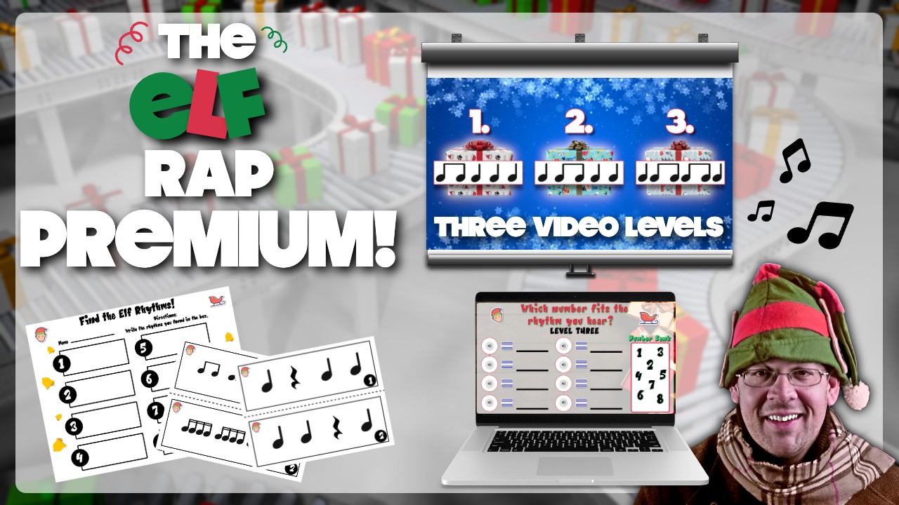 The Elf Rap Premium resource includes a variety of activities. The video section has three levels that are differentiated within the listening challenge to include a variety of rhythms. Two games are also included called "KaBOOM!" and "Write the Music Room." Further directions are included for these games within the section.