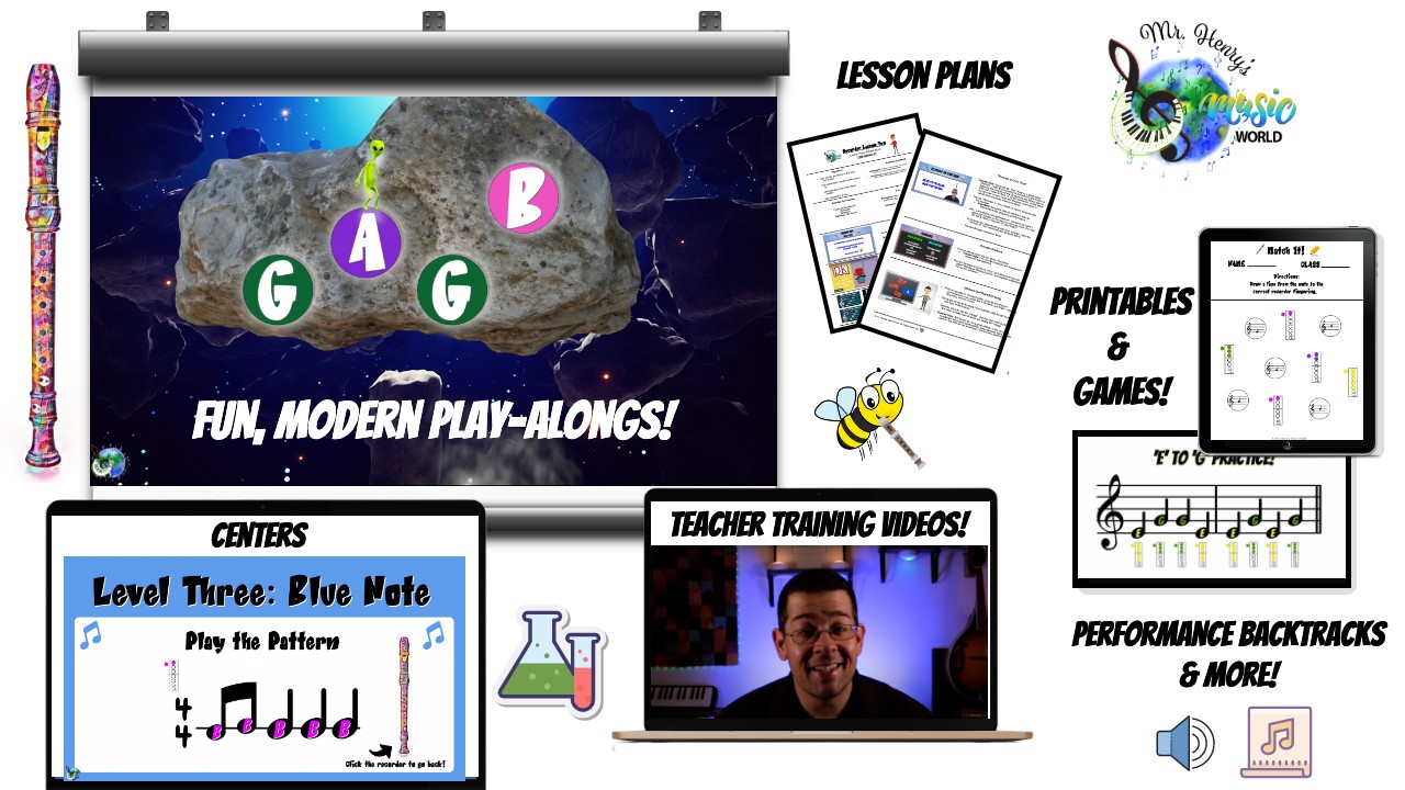 Grab a fun FREE recorder lesson with high-quality videos, slide presentations & printables to get your recorder program started in the right direction!